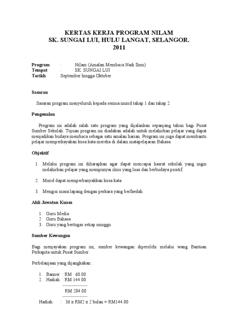 Kertas Kerja Program Nilam Sungai Lui Pdf